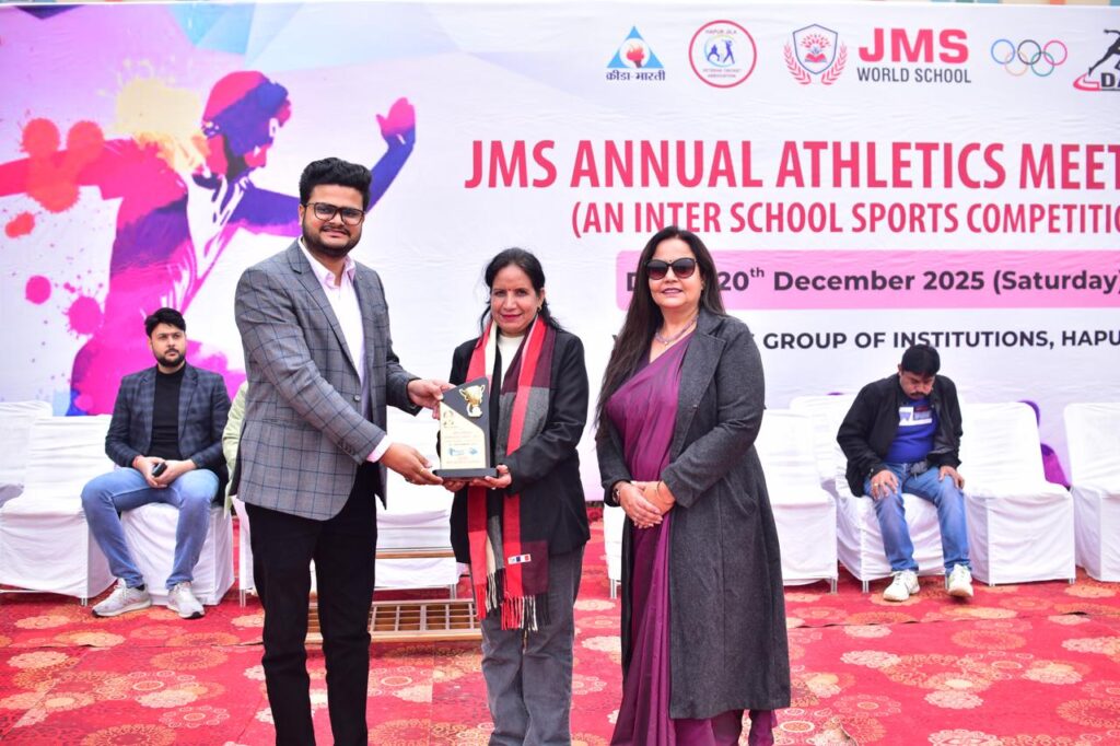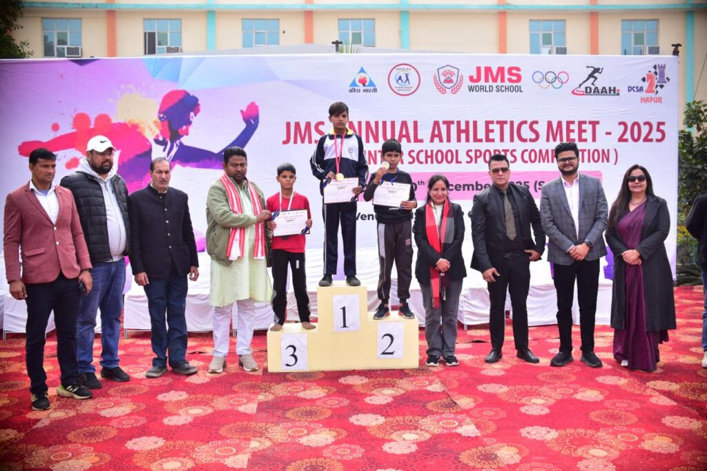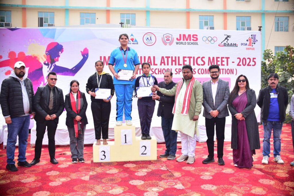 जेएमएस वर्ल्ड स्कूल, हापुड़ में “जेएमएस एनुअल एथलेटिक्स मीट 2025” का अद्भुत आयोजन किया गया, जिसमें अन्तरस्कूलीय एथलेटिक्स प्रतियोगिता के तहत 38 विद्यालयों के लगभग 450 खिलाड़ियों ने प्रतिभाग किया।